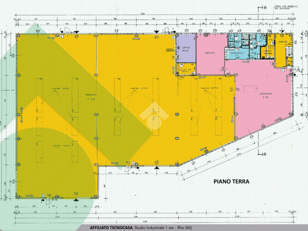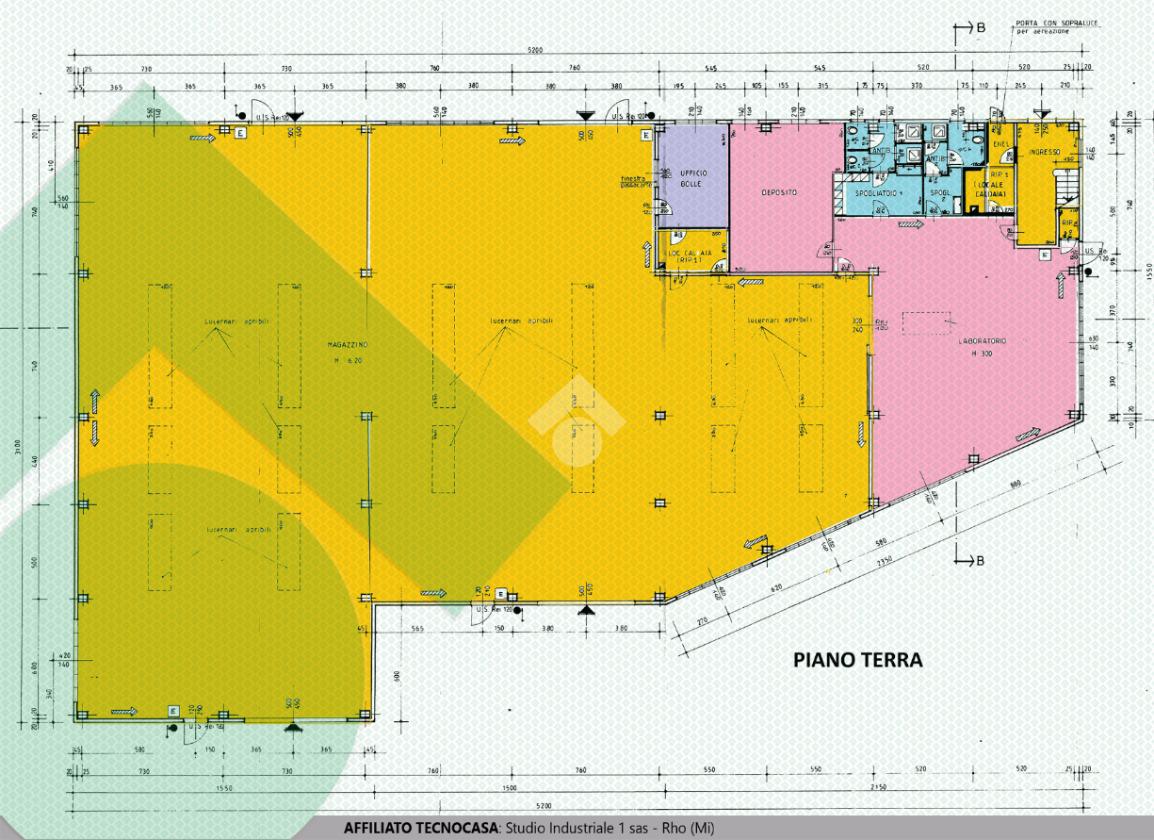 Il CAPANNONE si trova al piano terra e ha una superficie totale di 1325 mq con altezza sotto trave di 7m, ad accezione di una zona di 200 mq la cui altezza è di 3m; alla zona produttiva si accede tramite 4 passi carrai di H 4 x L 5. La superficie include un’area adibita a locali spogliatoi uomo e donna e 3 servizi igienici uomo e donna. Il pavimento del capannone è in cemento e gli infissi in alluminio. La zona lavorazione è dotata dei seguenti IMPIANTI: illuminazione, impianto elettrico a canale e in parte con blindosbarra, impianto antincendio esterno con idranti cassette UNI 45 e UNI 70, e impianto d’allarme.