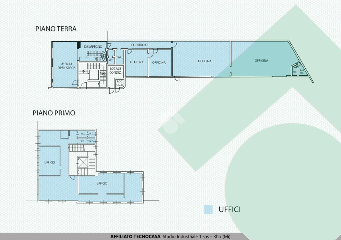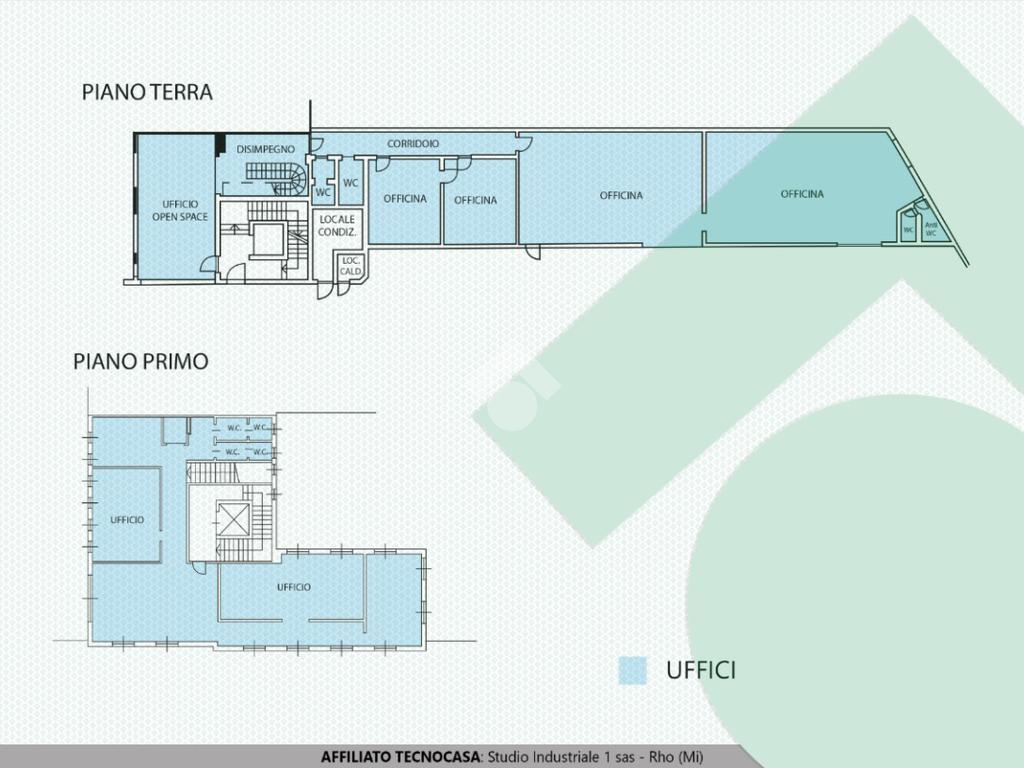 Collegati con scala interna ed eventuale ascensore, troviamo altri UFFICI di 200 mq posti al primo piano e suddivisi in vari locali più una sala riunioni e servizi igienici. Dotati di tutti i principali IMPIANTI: illuminazione, elettrico, telefonico, rete dati per computer e fibra ottica, riscaldamento autonomo e condizionamento a pompa di calore. Pavimento flottante, porte in legno e controsoffitto in gesso.